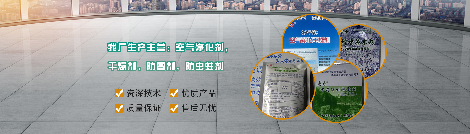 我厂生产主营空气净化剂,干燥剂,防霉剂,防虫蛀剂。